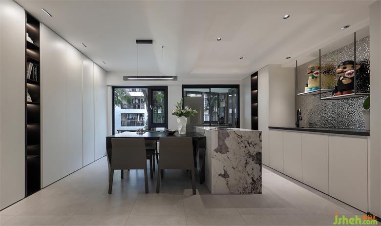 原廚房與餐廳合二為一,這里剛好又是入戶(hù)區(qū)域,進(jìn)門(mén)的視野非常開(kāi)闊。餐廳的兩端都做了整面到頂柜子,鞋柜、餐邊柜、雜物收納柜統(tǒng)統(tǒng)都有,日常囤貨、收藏、展示需求都得到了滿(mǎn)足!中心位置是島臺(tái)+可移動(dòng)式餐桌的組合設(shè)計(jì),使用更加靈活方便。