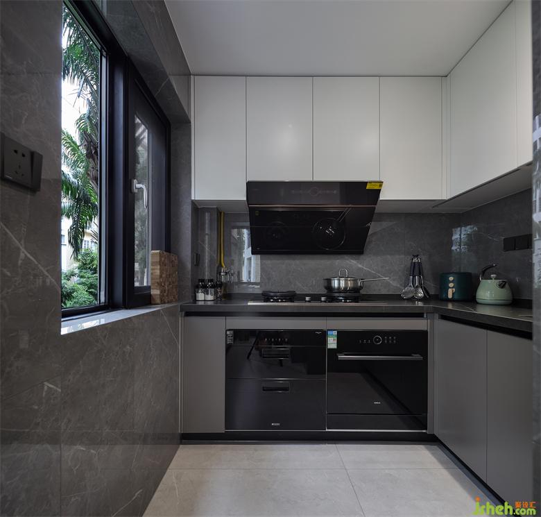 廚房區(qū)域簡(jiǎn)潔又靈動(dòng),L形的操作臺(tái)面動(dòng)線流暢、易于使用,將空間利用率最大化。深圳家裝設(shè)計(jì)廚房小幫手們也有自己專(zhuān)屬的位置,煎炒烹炸都不在話下!