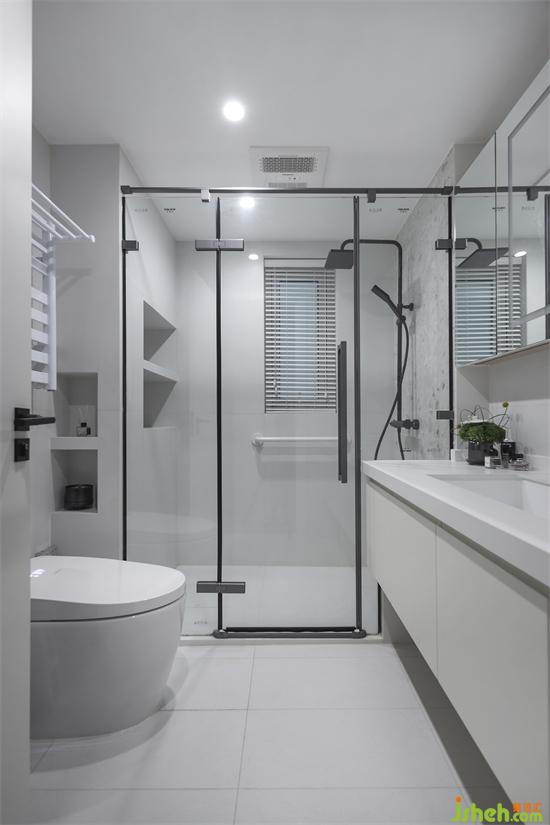 公共衛(wèi)浴間,沐浴間左側(cè)墻體和馬桶旁都挖出兩層置物臺(tái),輕松放置洗浴用品。深圳家裝設(shè)計(jì)洗手臺(tái)是白色石材臺(tái)面+吊柜懸空的設(shè)計(jì),下面鏤空的部分就可以用來(lái)放拖鞋啦。