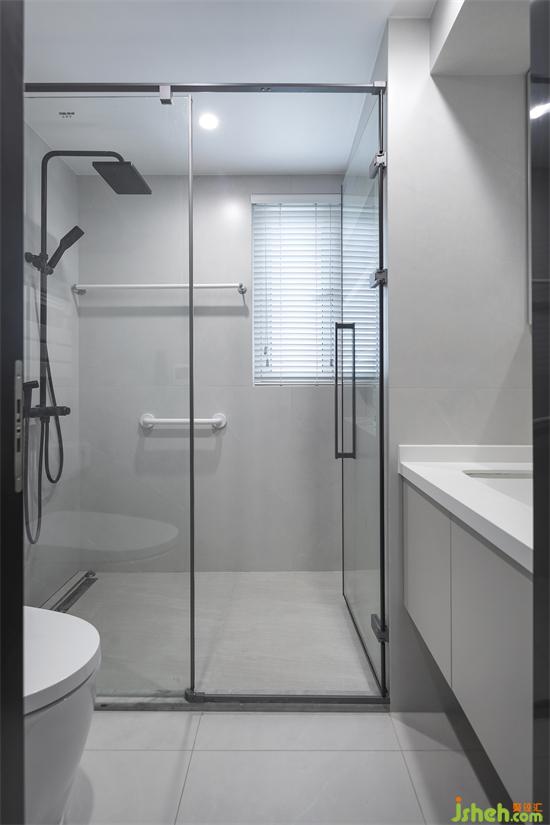 主衛(wèi)以溫柔大方的暖白色為主基調(diào),使用透明玻璃+黑框進(jìn)行干濕分離,相當(dāng)符合中老年人簡(jiǎn)簡(jiǎn)單單的生活方式。另外,考慮到中老年人的安全隱患,我們使用了防滑瓷磚和安裝護(hù)欄,設(shè)計(jì)師的細(xì)節(jié)與貼心值直接拉滿!
