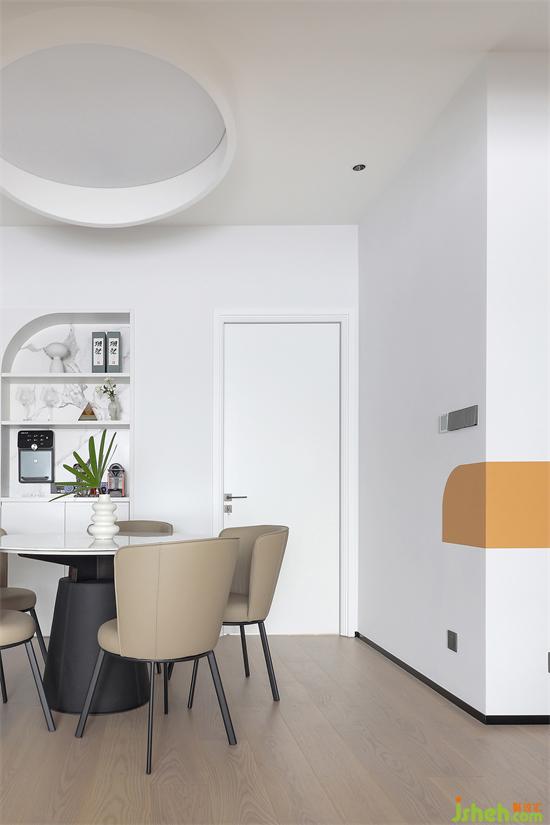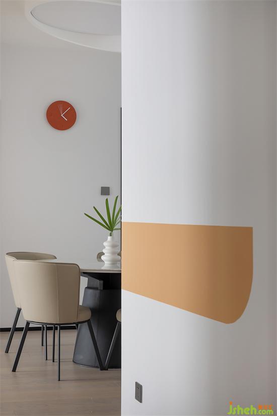 墻壁內(nèi)嵌半弧酒柜,過(guò)道在入戶延伸區(qū)墻面同樣沿用愛(ài)馬仕跳色點(diǎn)綴,無(wú)論是半弧的元素還是色彩的搭配,都與空間主題交相呼應(yīng)。