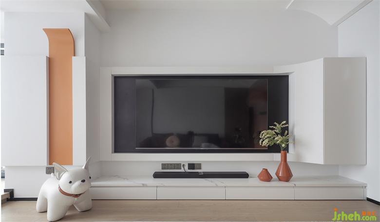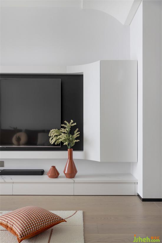 電視背景墻利用原陽(yáng)臺(tái)柱子以延伸、轉(zhuǎn)角的設(shè)計(jì)手法將整個(gè)背景墻加寬,同時(shí)局部用弧形元素點(diǎn)綴,敞亮的客廳就這樣出來(lái)啦!右側(cè)白色區(qū)域是個(gè)頗具深度的柜子,實(shí)用與顏值均在線噠!
