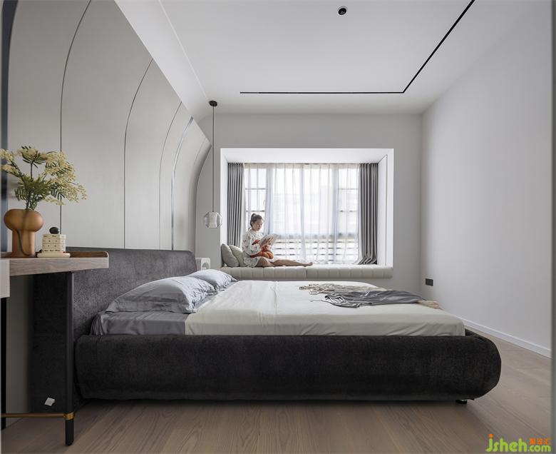騰出專(zhuān)屬衣帽間和衛(wèi)生間的主臥室,留給休息區(qū)的空間不算太大,但安放一張大床還是綽綽有余的!床頭背景延續(xù)弧形元素,面貼皮革,天花頂面磁吸燈為主光源,燈帶做輔助光源,簡(jiǎn)約舒適,靜謐休憩。