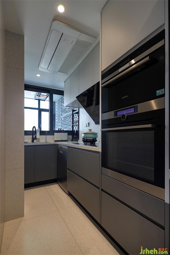 廚房同樣是以大收納為主,所以安裝了大面積的吊柜和地柜。即使騰出了一個(gè)公衛(wèi)的空間,仍然可以做到收放自如。素雅顆粒水磨石替代墻磚地磚,實(shí)際上也最大程度節(jié)約了空間,當(dāng)然,最重要的還是呈現(xiàn)了復(fù)古流行的視覺(jué)效果,而水磨石地面的防滑性能也是絕絕子!