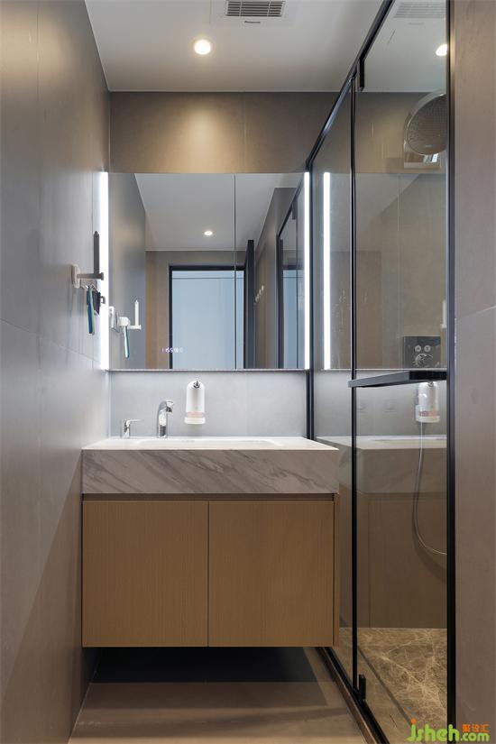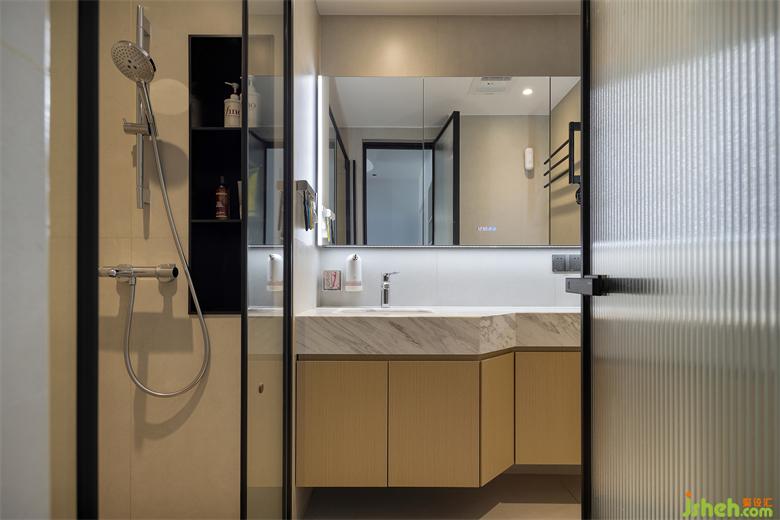 考慮到業(yè)主長期居住國外的生活習慣,對裝修選材的實用性和功能性都十分考量,客餐廳和臥室大面積使用木地板,而衛(wèi)生間選用的是仿砂巖磚,增加防滑系數(shù),也是相當素雅。