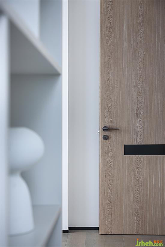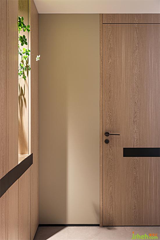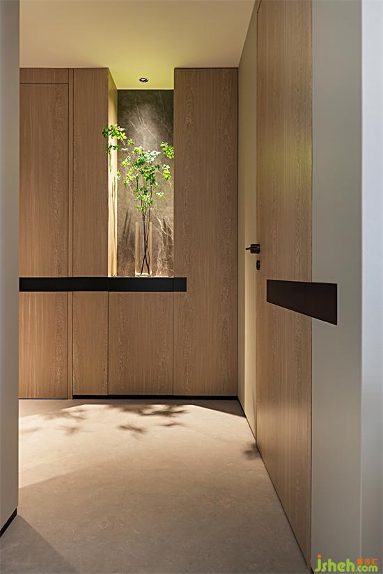 過(guò)道采用儲(chǔ)物柜填充凹陷部門(mén),增加收納功能。柜門(mén)統(tǒng)一配上黑色腰線,與房門(mén)向外拓展至墻面的黑色腰線相呼應(yīng),這個(gè)過(guò)道簡(jiǎn)直太愛(ài)了!