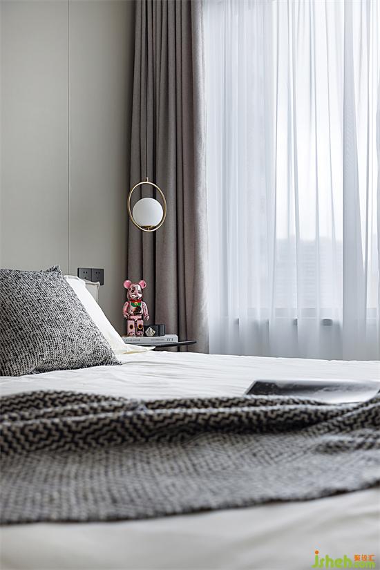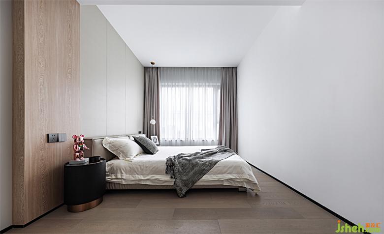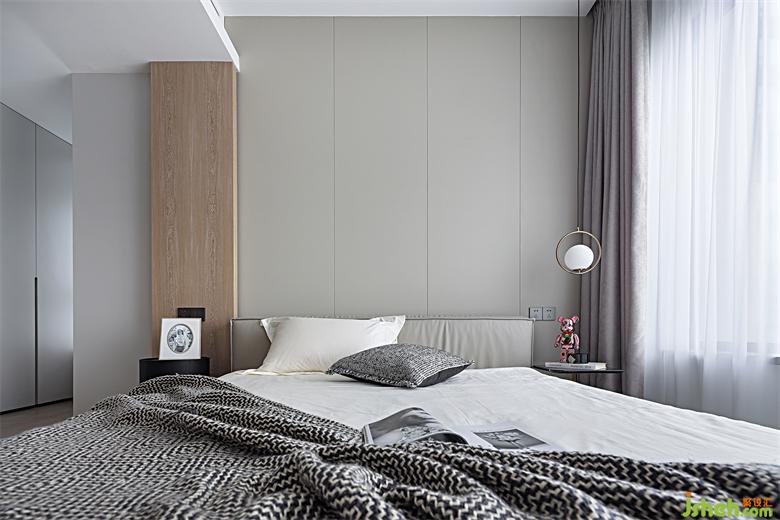 臥室同樣是無(wú)主燈設(shè)計(jì),僅用燈帶結(jié)合單側(cè)吊燈予以裝飾,床頭背景延續(xù)公共區(qū)域的滿(mǎn)墻護(hù)墻板設(shè)計(jì),干凈利落。整個(gè)臥室空間仿佛洗卻所有生活的條條框框,灑脫自如地躺在床上,盡情放松就是啦~