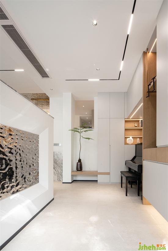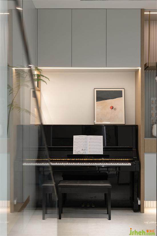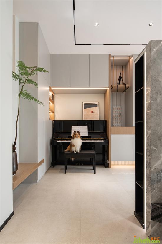 鋼琴的一角,是業(yè)主的氣質(zhì)涵養(yǎng),音符圍繞的生活,是高山流水也是婉轉(zhuǎn)悠揚(yáng)。側(cè)邊木格柵的細(xì)節(jié)設(shè)計(jì),與客廳的沙發(fā)墻相呼應(yīng),有特色卻不孤立,恰到好處。家裝設(shè)計(jì)寬敞的過道,也有足夠的空間讓狗狗盡情玩耍,且收納空間充足,寵物用品也不用愁置放處。