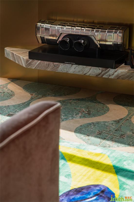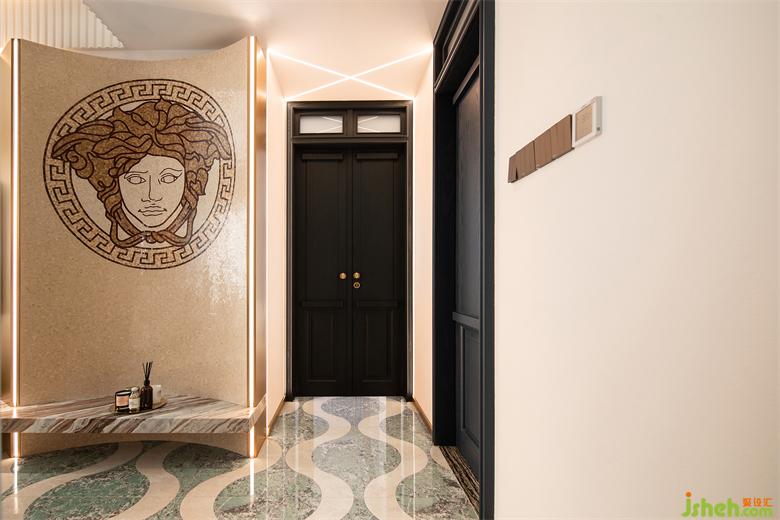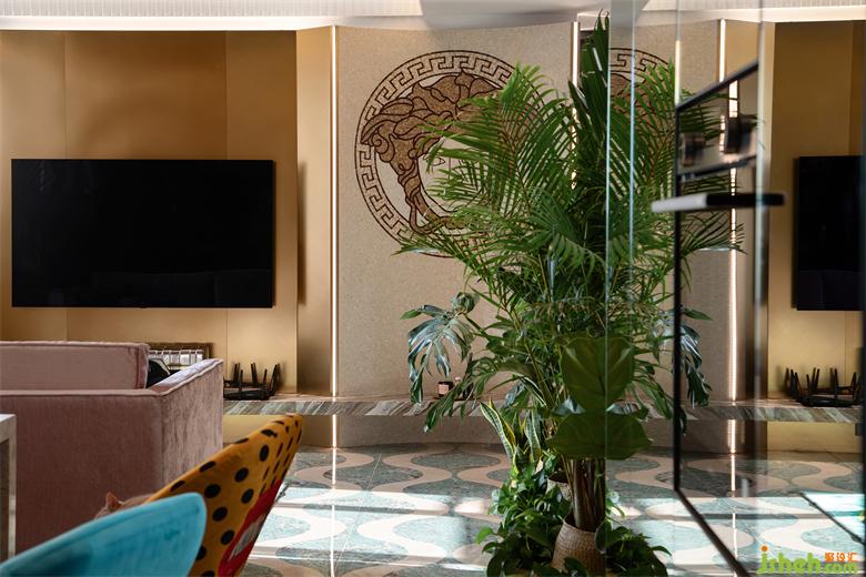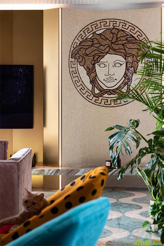客廳的另一端,是富有小心機的電視背景墻。金屬材質(zhì)手感細膩不易沾灰,搭配斜面、弧形的元素,穿插式設(shè)計令背景墻更加生動立體。家裝設(shè)計個性化的VERSACE拼花彰顯獨特的異域風情,更傳遞著風格鮮明、致命吸引力的濃厚藝術(shù)寓意。