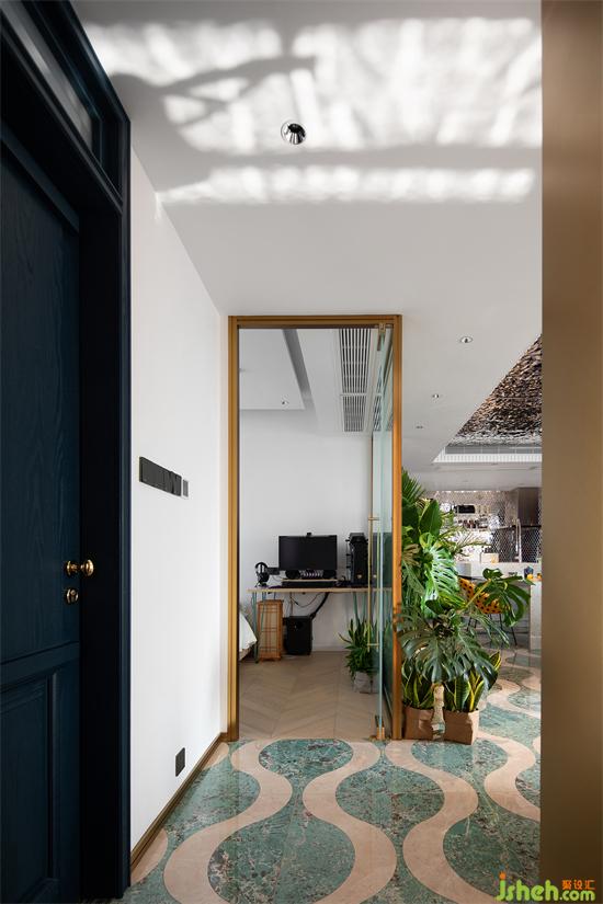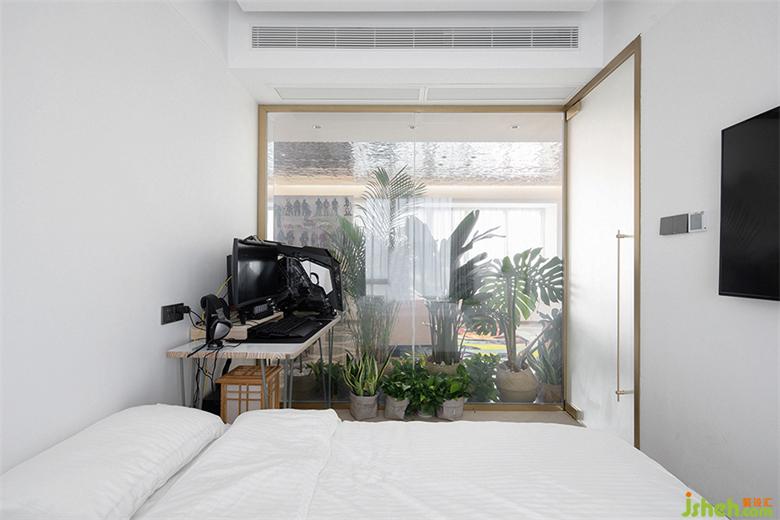 綠植蔥郁掩護之下,走進一瞧才發(fā)現(xiàn),客廳里竟然還藏了個客房!因為平時使用頻率不高,砌實墻不僅占用空間還影響采光,索性選用電動霧化玻璃做隔斷!日常保持通透狀態(tài),完美與客廳融為一體;使用時有遮擋效果,隱私性得以保障,perfect!
