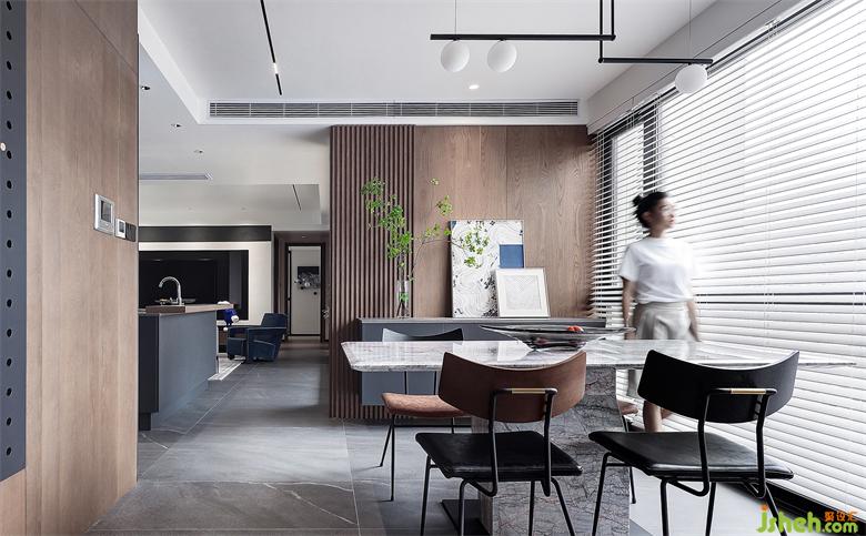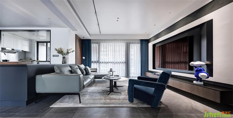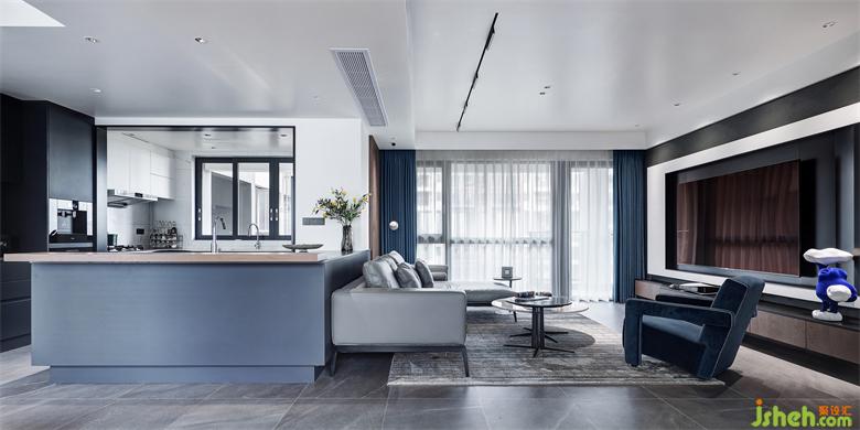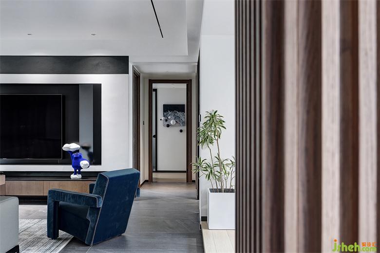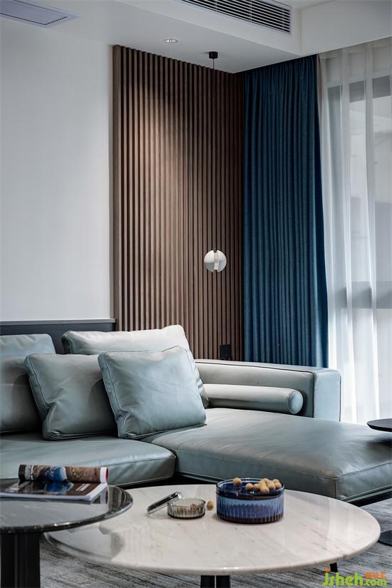 以Y先生最喜歡的深海藍(lán)為基調(diào),搭配沉穩(wěn)、酷雅的深灰色和木色,選用烤漆、大理石、木格柵和絨布等多種材質(zhì),打造極具高雅格調(diào)的現(xiàn)代極簡(jiǎn)空間。
