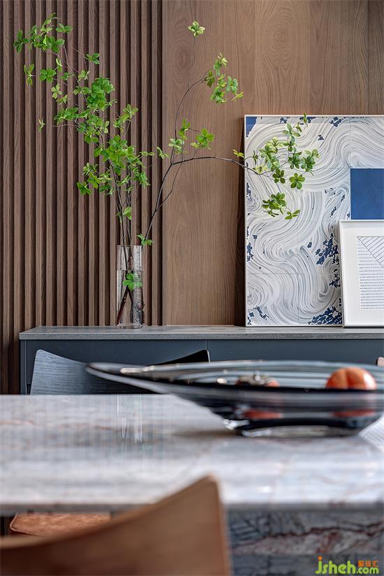 客廳、餐廳、廚房、書房四室打通,沿承重墻而建的半通透隔斷,在線條與塊面的碰撞之間,勾勒出公共區(qū)域的層次感。