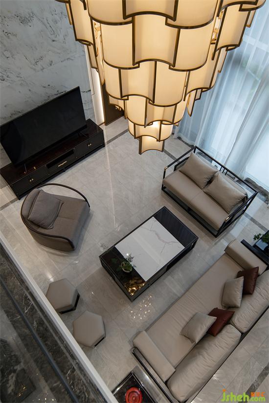 一層大挑空視線開闊,并可以飽覽窗外的海景。仿云彩的電視墻,山水意境的沙發(fā)背景,選擇了木質(zhì)、皮質(zhì)、金屬等材質(zhì),別墅裝飾讓整個空間充滿中國古典之美。