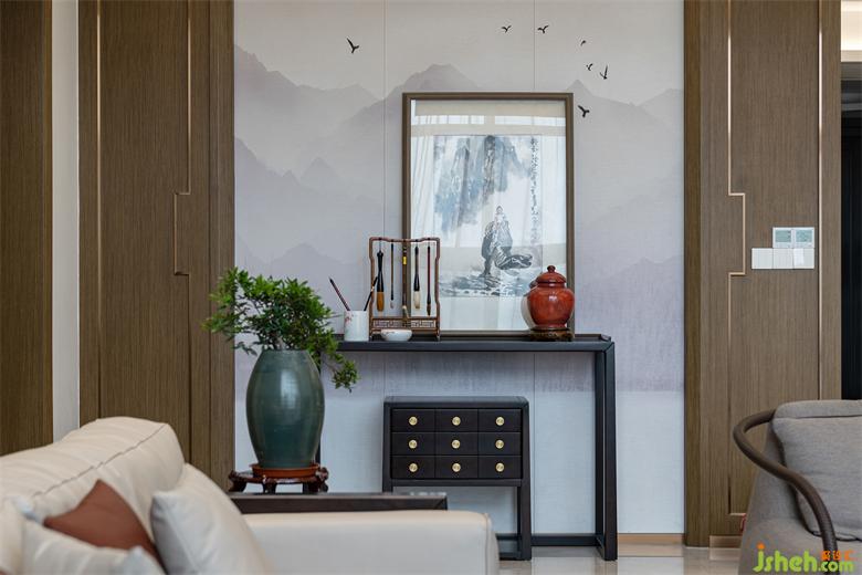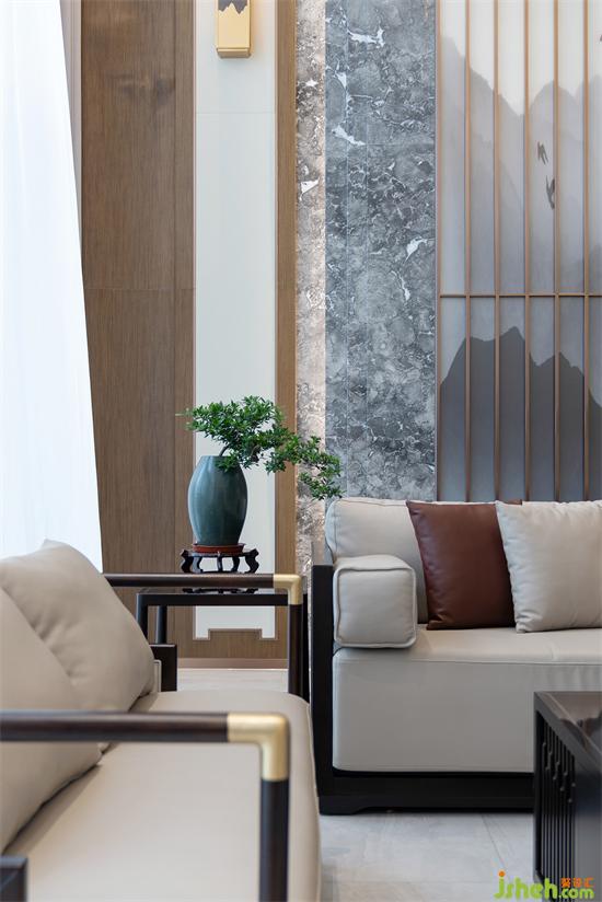 大理石與木質(zhì)不同色調(diào)的結(jié)合打造了空間的質(zhì)感和親切感,中式綠植的裝點(diǎn)讓空間更加有生氣,中式極簡(jiǎn)的沙發(fā)造型、山水裝飾畫、中式擺件營(yíng)造空間東方美的意境。