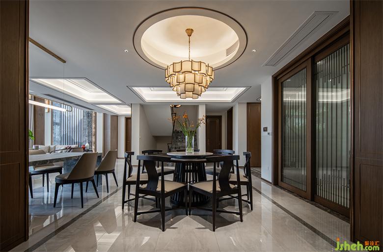 空間設(shè)計(jì)講究在日常生活中顯示品位與品質(zhì),餐廳背后用兩個(gè)儲(chǔ)物柜,別墅裝飾了展示的區(qū)域,方便業(yè)主藏酒展示,在節(jié)日聚餐中方便拿取,為空間提升檔次。