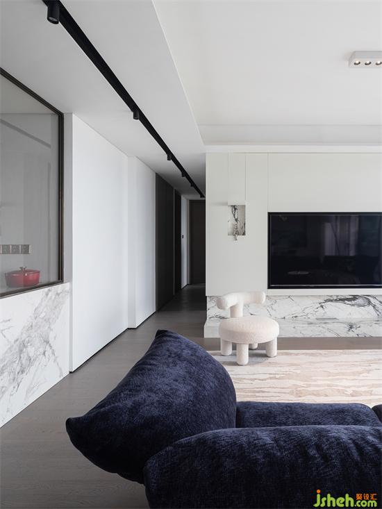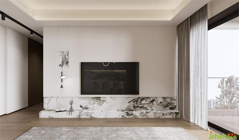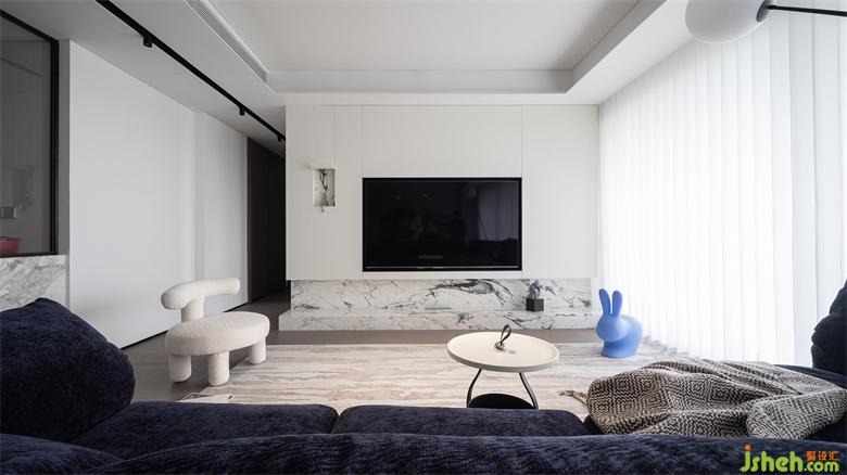 步入客廳,就能感受到現(xiàn)代簡約風(fēng)格的干凈通透。家裝設(shè)計(jì)師以白色為主的電視背景墻搭配潘多拉大理石地臺(tái),瞬間搶占了視覺中心,呈現(xiàn)出天然石材流淌的自然質(zhì)感。為保持美觀,提前規(guī)劃電視尺寸大小,四邊預(yù)留3cm寬,更顯精致。