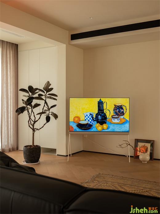 2、巧妙利用陽臺(tái)包柱空間打造壁爐裝飾,增加客廳氛圍感與設(shè)計(jì)亮點(diǎn)。