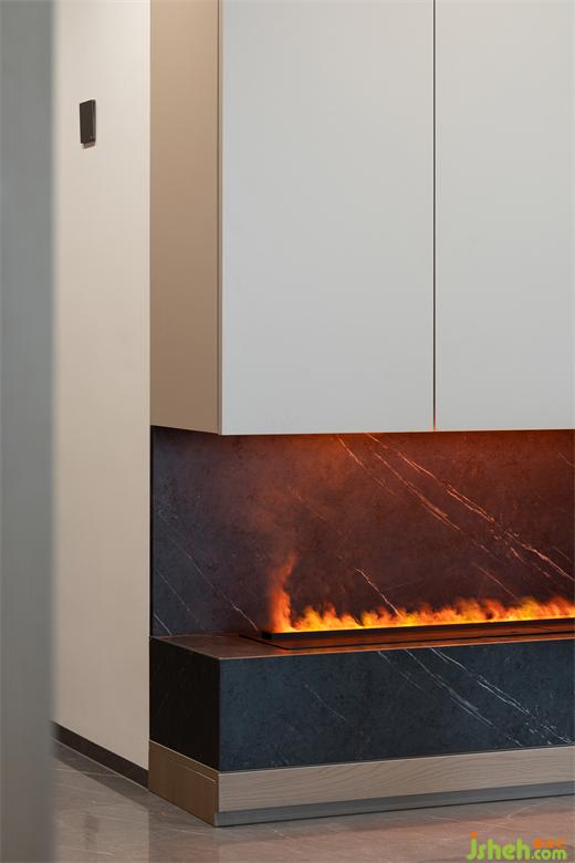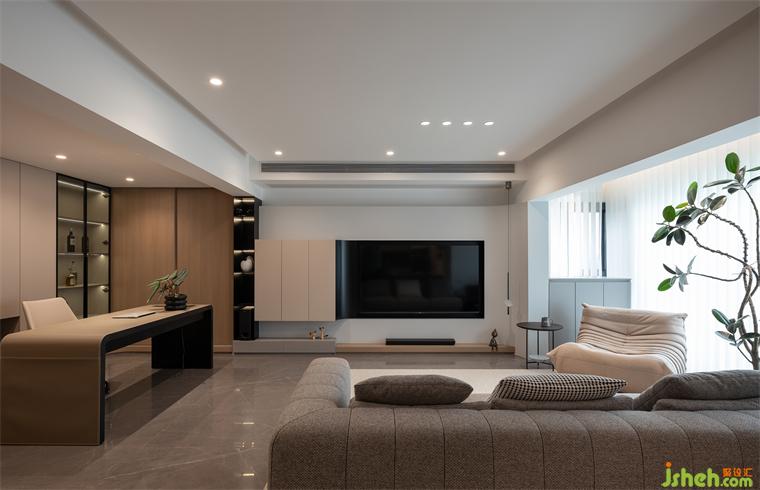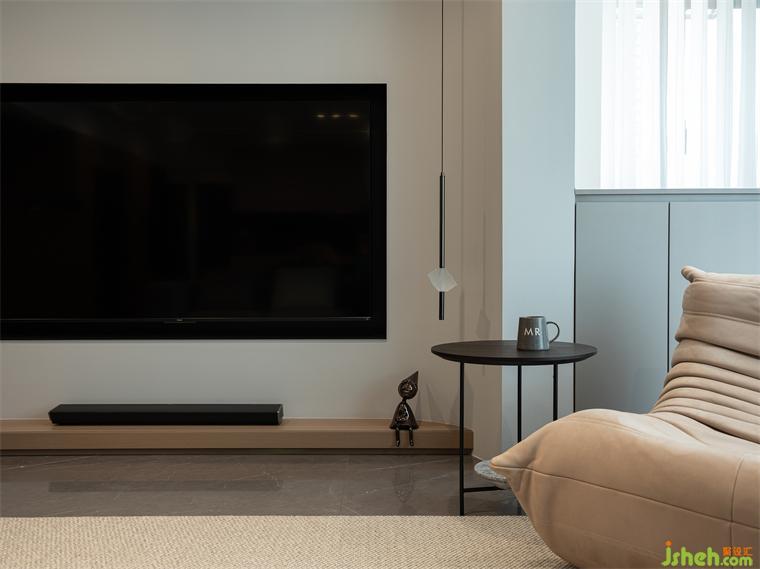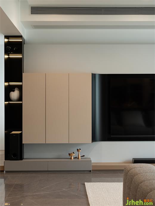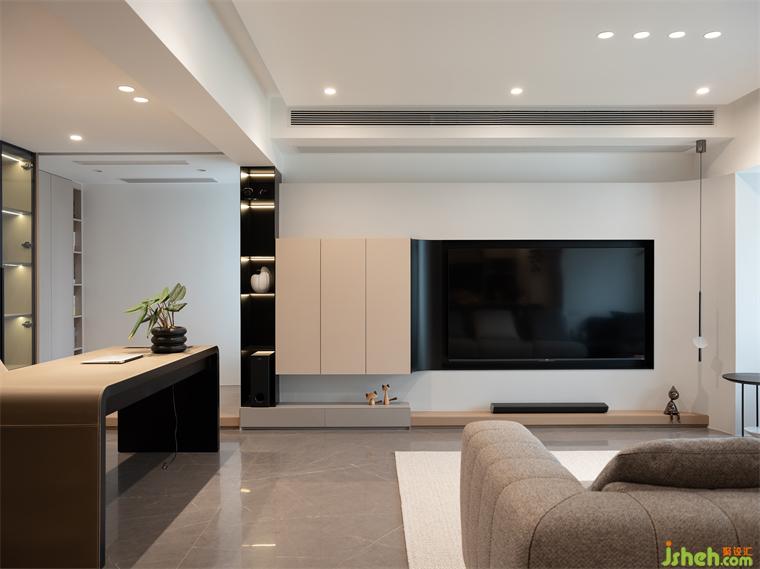 3、客廳電視背景+地柜采用雙弧形設(shè)計(jì),既弱化了陽臺剪力墻體,又優(yōu)化了整體的立面造型。
