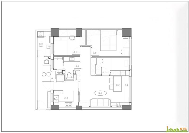 2、在主臥、次臥與衛(wèi)生間三處劃出過(guò)道區(qū)域,使得各處空間有了更多的私密性;