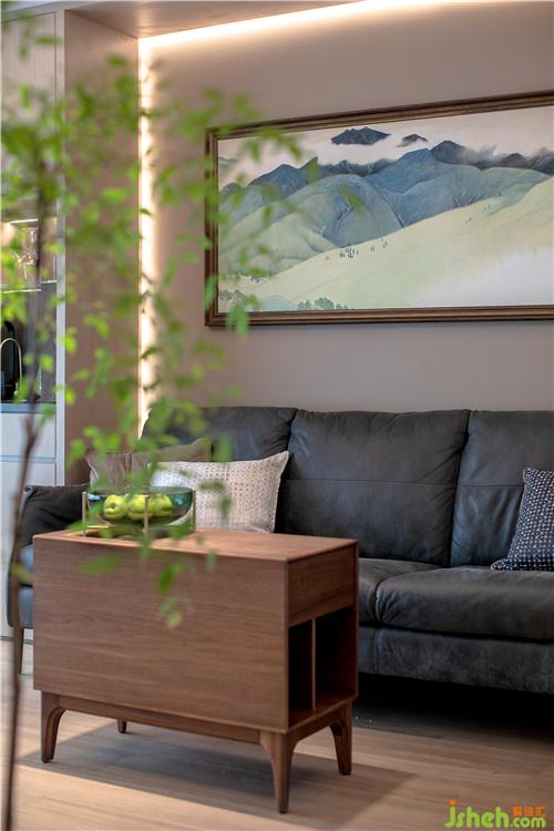 灰色與木色組成了客廳的主要色調(diào)?;疑驼{(diào)、潔雅,木色自然、親切。兩者相得益彰,構(gòu)成一幅協(xié)調(diào)溫馨的畫面。