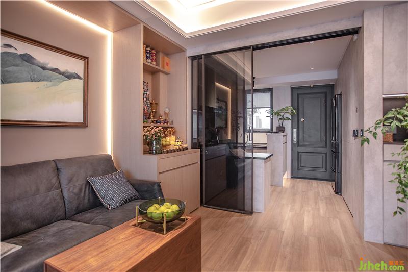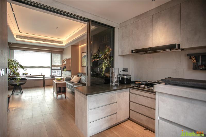 入戶便是廚房,與客廳相接。為了避免廚房油煙竄進(jìn)客廳,所有便在在廚房與客廳之間加裝上一道啡色自動(dòng)門。做飯的時(shí)候,把門關(guān)上,避免油煙飄到客廳。平時(shí)便是打開的狀態(tài)。