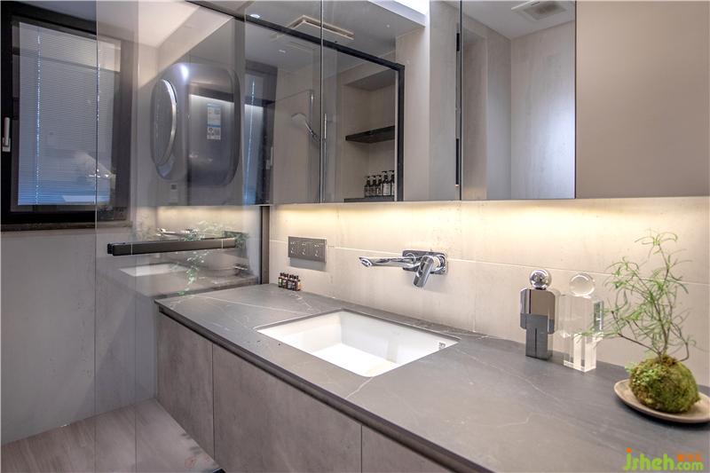 公衛(wèi)的格調(diào)與房子的整體設計保持一致,干凈舒適。暖調(diào)燈光,照出年輕好氣色。同時主人愛藏物的小心思再次體現(xiàn),上有三開鏡柜,下有三開梳洗臺柜,再多的物品皆可收納。