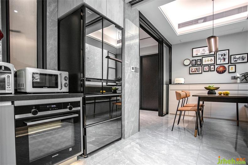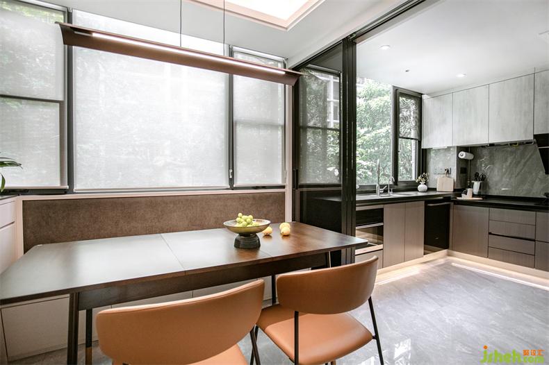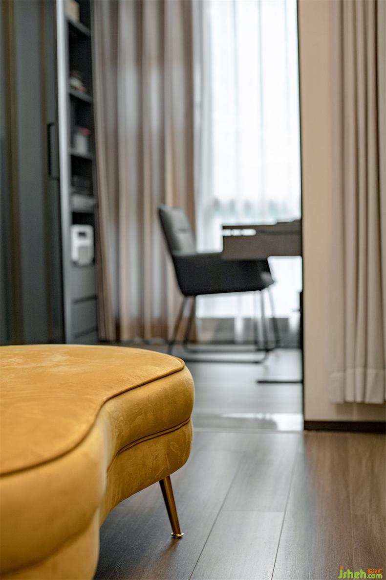 主臥的對(duì)面是多功能室,即獨(dú)立衣帽間&書房,考慮到整潔性,室內(nèi)設(shè)計(jì)師衣帽間一面選用了黑色玻璃柜體,一面是木飾面柜體并鑲嵌了一扇鏡面,經(jīng)常外穿的可以一眼看到,又不會(huì)顯得雜亂。