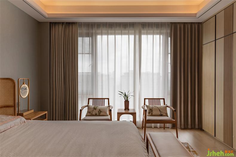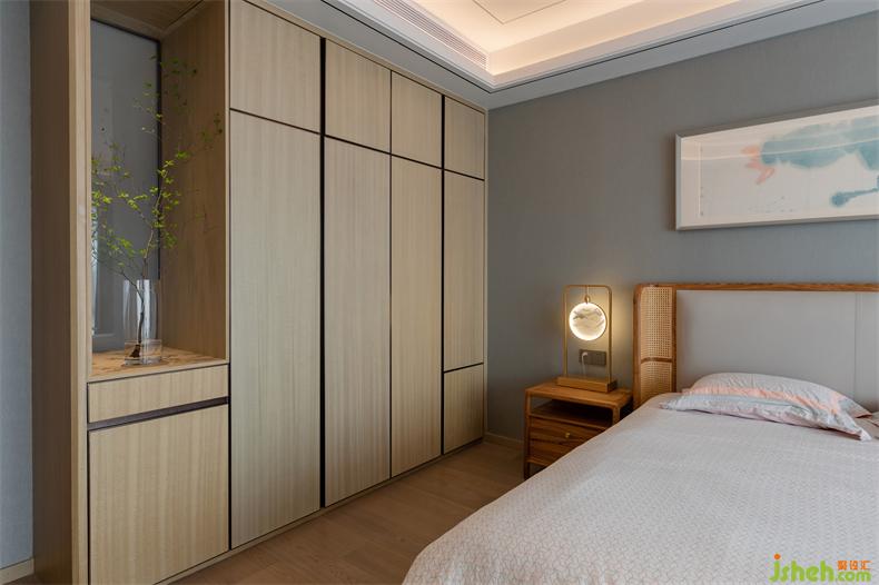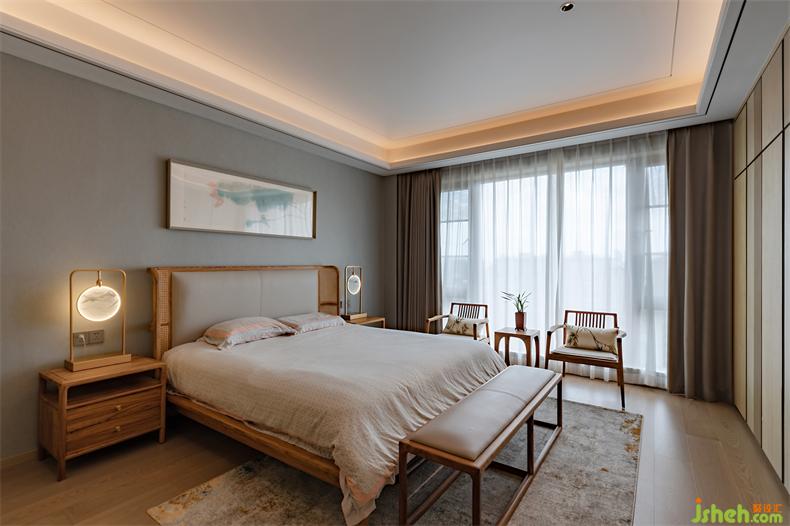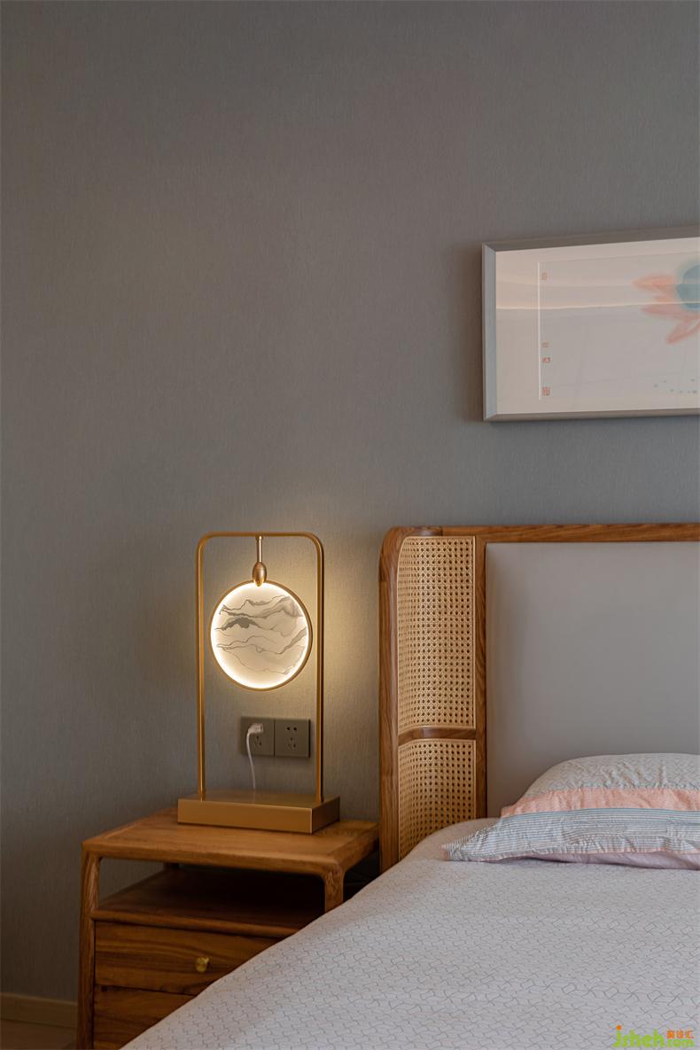 山河墨卷以各種形式連綿在空間里,一幅畫(huà)作、一種材質(zhì)的紋理,室內(nèi)設(shè)計(jì)師甚至餐桌細(xì)節(jié)處,對(duì)應(yīng)窗外,仿佛自然沒(méi)有了界限。中國(guó)人自古就寄情于山水,哪怕寥寥幾筆足以將內(nèi)心的思緒借以表達(dá),主臥便是如此,簡(jiǎn)雅為上,自然包裹,讓人不由而然的放松下來(lái)。床頭燈似玉映照山澗,荷花影朦朧清麗脫俗,藤珊巧圍,木色溫暖柔和,室內(nèi)設(shè)計(jì)師線條呈優(yōu)雅儀態(tài)。