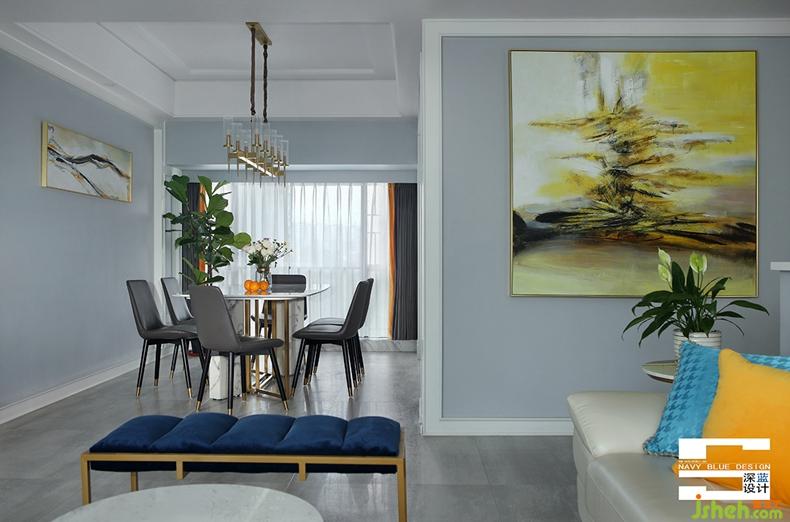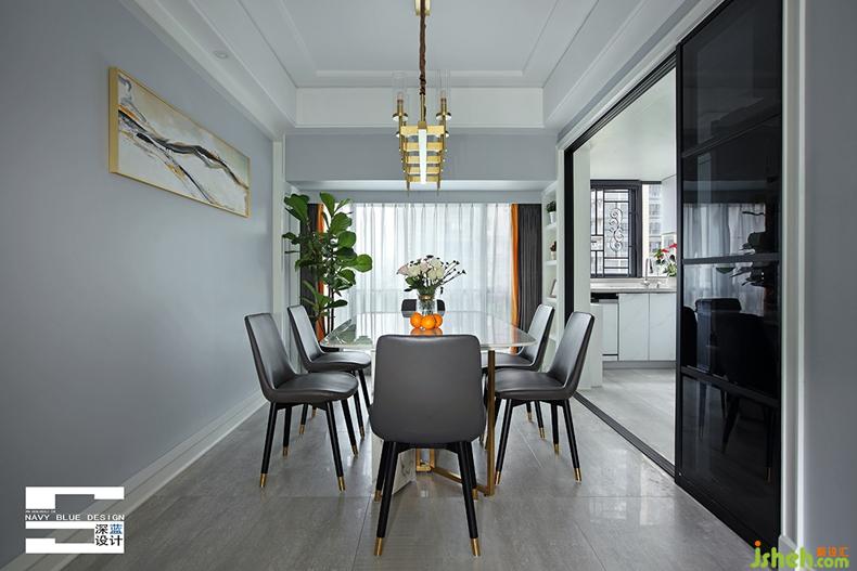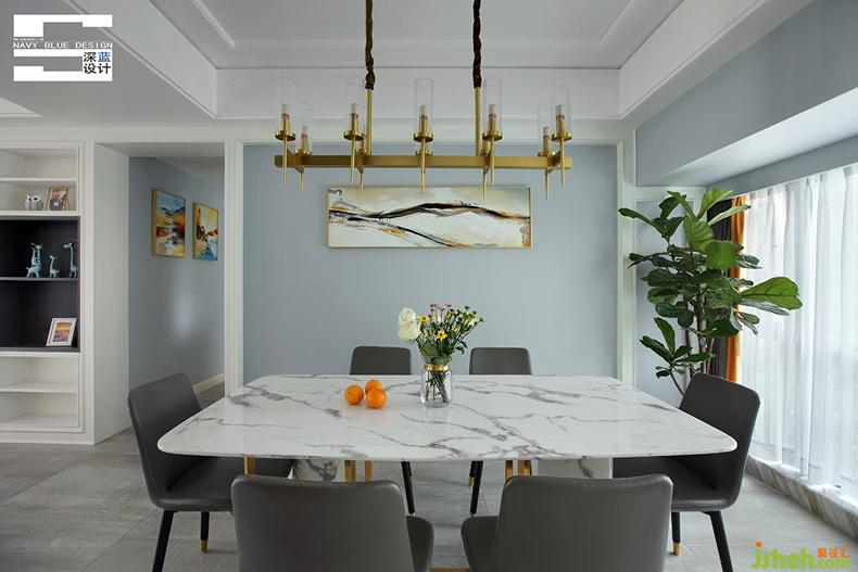 大理石材質(zhì)與金屬元素的搭配,簡(jiǎn)潔輕奢中不乏清麗優(yōu)雅。一側(cè)的全景落地玻璃窗保證了餐廳的采光,窗紗拉開(kāi)之時(shí),也將室外的美景納入室內(nèi)。
