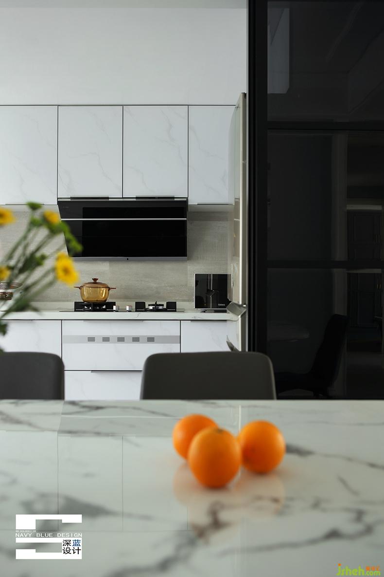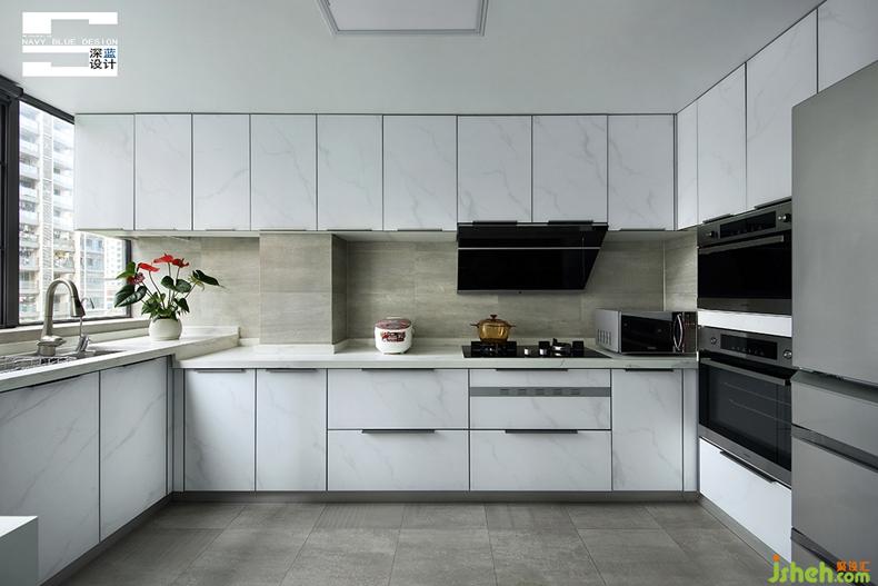 廚房由原來(lái)的生活陽(yáng)臺(tái)改造而成,灰白色系的U型櫥柜不僅豐富了空間功能性,更使其在視覺(jué)上更為鮮明利落且寬闊舒適。