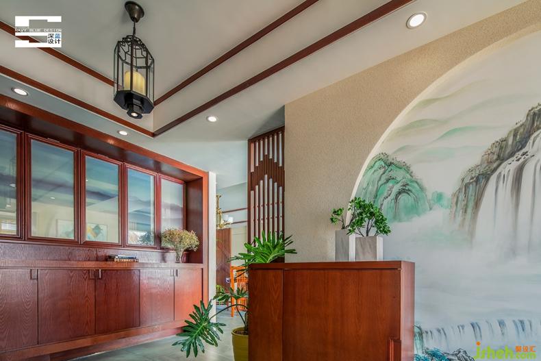 門廳是原木的視界,溫潤的木頭將兒時有棱有角的記憶裹挾得十分完整;便是一只鼓墩兒、一盞仿古燈、一墻手繪瀑布,虛實相映之間,意境相融之時,一切都被潤澤得恰到好處。