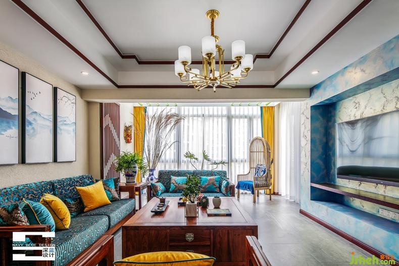 木為基,明黃為序,湖藍(lán)為文,設(shè)計師以不同的色彩層次將客廳的故事節(jié)奏拿捏得有輕、有重、有緩,亦有急,如同舊時生動而干凈的故事。