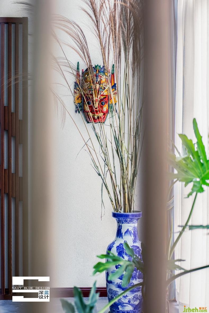 青花瓷瓶內(nèi),蘆葦叢生,心若有向,一葦可航。一張原木色的中式椅與蘆葦?shù)奶烊活伾嘁r,閑時端茶落座,正對地戲面具,閉上雙眼仿佛可以聽見從家鄉(xiāng)傳來的弋陽老腔余韻。
