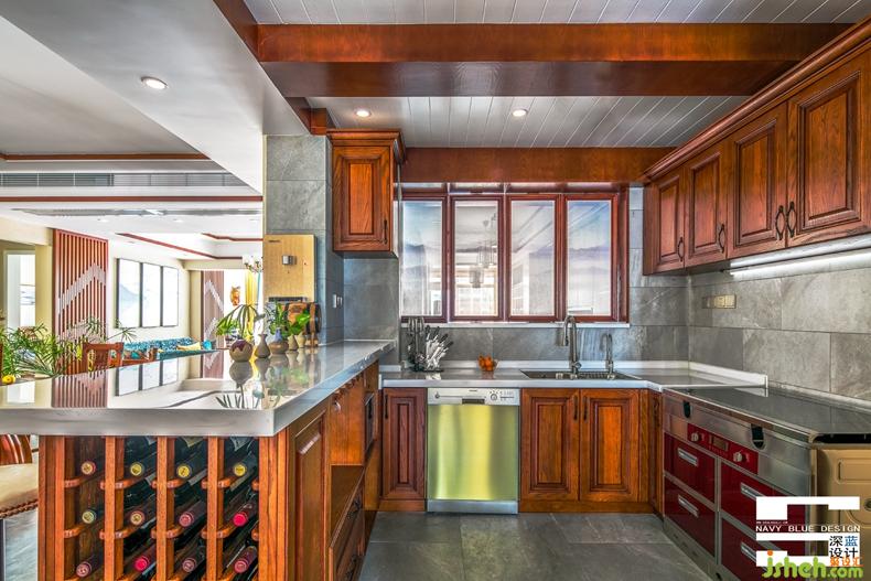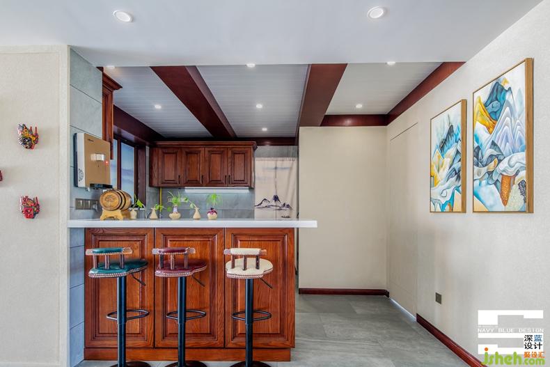 室內(nèi)設(shè)計(jì)師將原來(lái)的廚房改成了開(kāi)放式廚房,增加了吧臺(tái)空間,不失為一個(gè)休閑好去處,U型櫥柜也為廚房增加了不少收納空間。一副山水卷簾,一處深遠(yuǎn)意境。