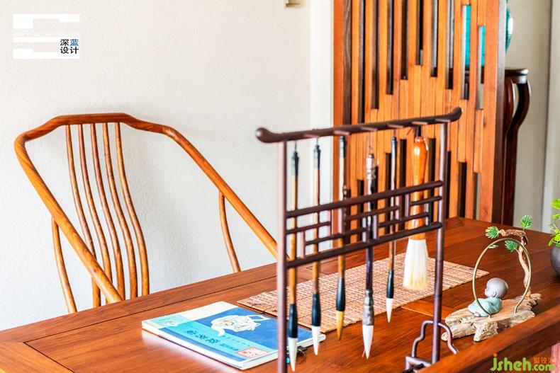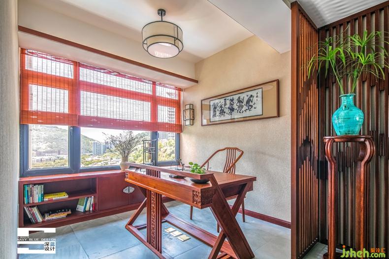 木色屏風(fēng)之后,是一桌、一椅、一案牘。開(kāi)放式設(shè)計(jì)令書(shū)房更顯大氣通透,一剪窗外光,半響讀書(shū)時(shí)。
