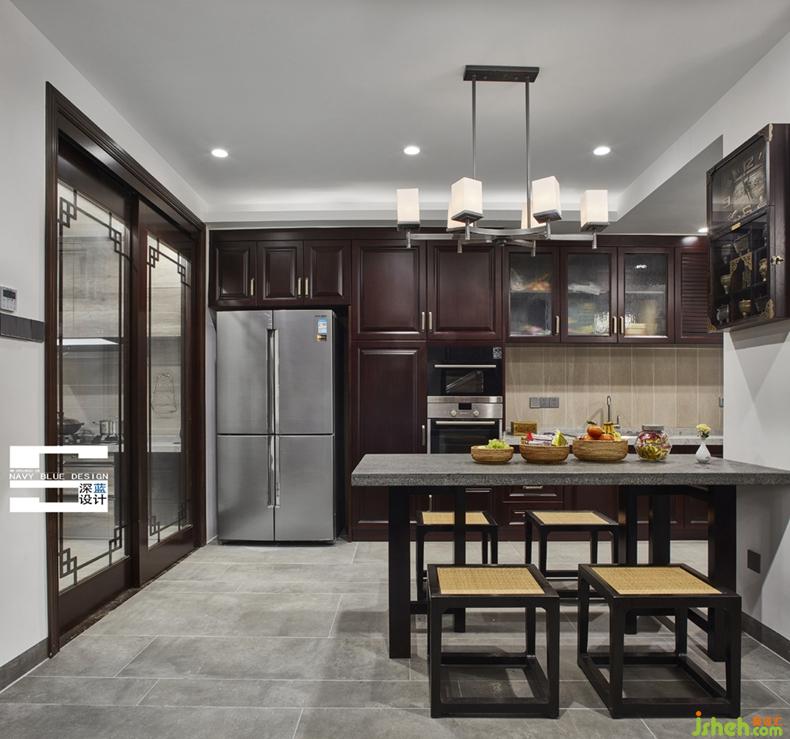 靠墻高柜與操作臺,完美解決了非油煙廚房操作的需要,火燒石臺面的島臺,滿足了便餐以及手工操作面點(diǎn)、甜品等現(xiàn)代餐廚不可或缺的功能需要。