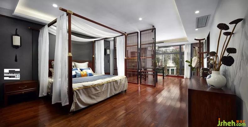 主臥空間寬敞舒適,深灰床頭搭配米色床品,在白色床幔與木色格柵的陪襯中,光氛的氤氳足以帶入寧靜愜意的休憩氛圍。