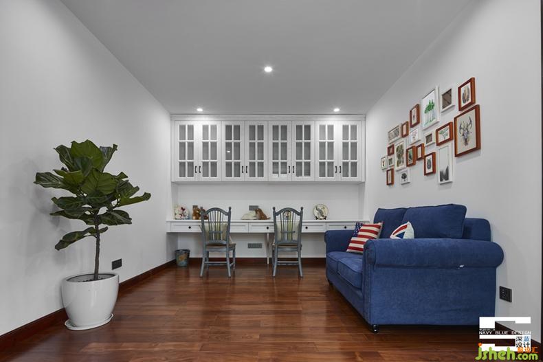 開(kāi)放式起居廳,用于小朋友們學(xué)習(xí)和玩耍,靠墻的整排書(shū)桌與書(shū)柜,方便輔導(dǎo)作業(yè)和學(xué)習(xí),舒服的布藝沙發(fā),互動(dòng)與休息,墻上的家庭照片墻,增加親子氛圍。