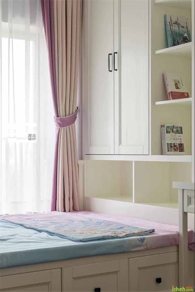 煙紫色與藍(lán)色交織的清爽色調(diào),給女孩編織了一個(gè)輕松愉快的成長環(huán)境??臻g雖小,但設(shè)計(jì)了寫字板、書桌、書架,功能齊全。