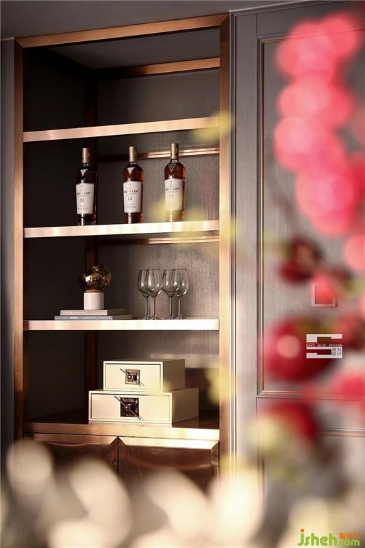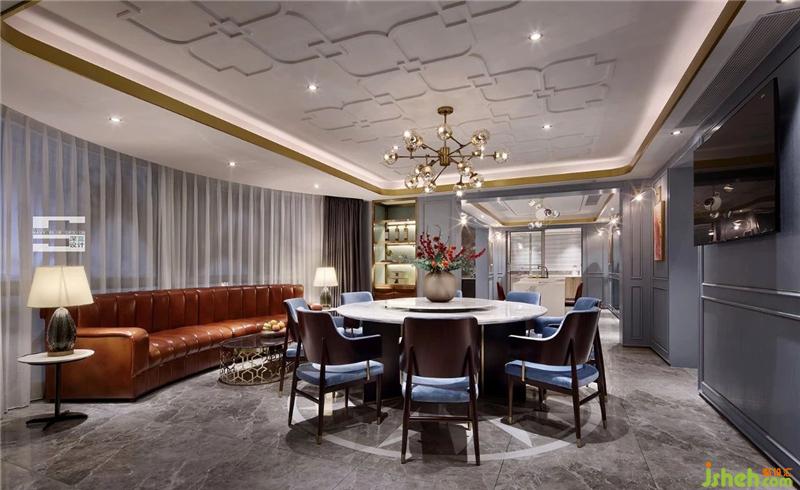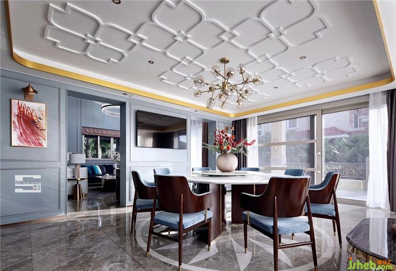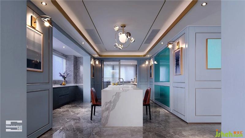 圓在中國有著一家人團(tuán)團(tuán)圓圓的寓意,在儀式感很重的餐廳中配以白色大理石圓形餐桌,不僅提升空間的亮度,更有助于家人之間情感的升溫;吊頂之下淡雅大理石的圓桌搭配深木飾面座椅,椅腿與阿瑪尼的藍(lán)色絲絨坐墊,無一不從細(xì)節(jié)上展現(xiàn)設(shè)計(jì)師的巧妙心思;金屬邊框紅色藝術(shù)掛畫打破靜謐的氛圍,使餐廳多了一份熱鬧、活潑,仿佛聽到一家人圍坐在餐桌邊吃飯時(shí)歡聲笑語。