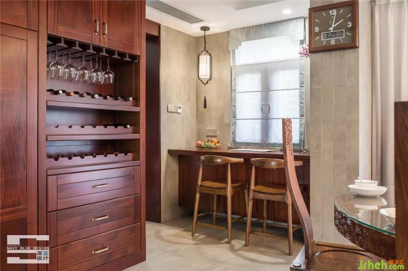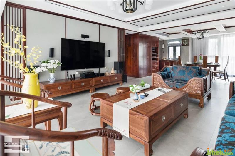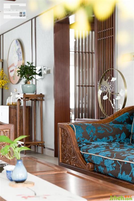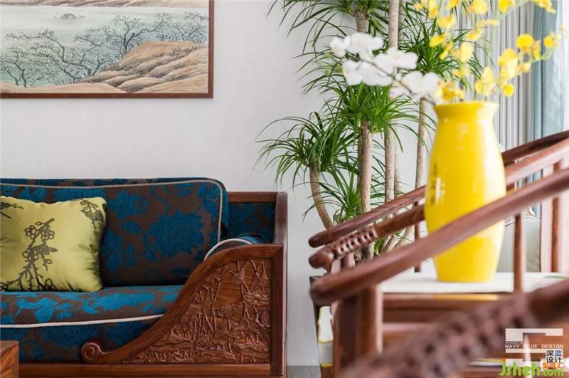 細節(jié)上,每一件物品的花紋和配色,都相輔相成。古典藍沙發(fā)墊、深黃色花瓶、黑白相配的燈具、綠植盆景,調(diào)和深棕木色的厚重感與沉悶感,空間充滿潮氣與活力視覺慢慢變得溫暖、柔和,透露出一股低調(diào)又高雅氣氛。