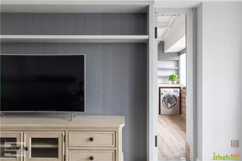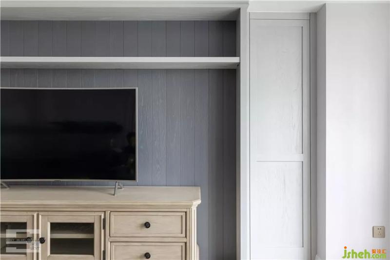 灰色護墻板鋪滿整個電視背景墻,沒有多余的裝飾,簡明干凈。