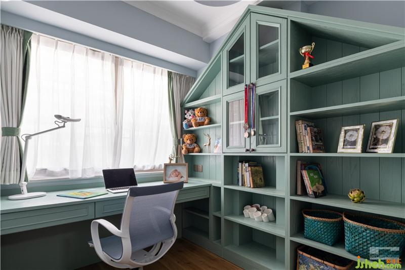 廚房是采光弱區(qū),薄荷藍的櫥柜和白色大理石紋的墻壁使廚房變得明亮,自然光線透過玻璃窗照射進來,廚房變得通透。