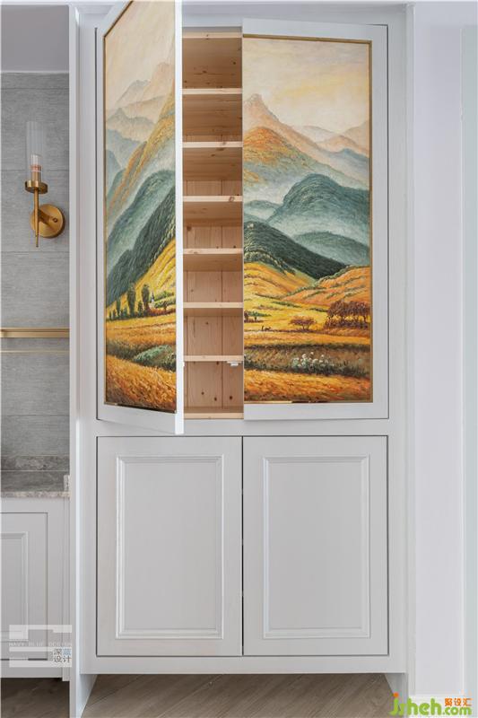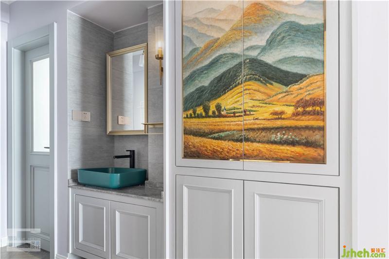 設(shè)計(jì)師了用過道的優(yōu)勢(shì),將衛(wèi)生間洗手臺(tái)外置,緩解衛(wèi)生間的空間緊張感,又增加便利性;門廳的鞋柜上的鄉(xiāng)村風(fēng)景畫,豐富飽滿的自然色彩,透露出一股溫暖的氣息,讓人浮現(xiàn)《最后、起始,現(xiàn)在》里的“最后的一朵月季格外猩紅,最后的一片野菊格外嬌黃,最后的一片荷田、金的梗上垂著枯葉”,詩意滿滿。