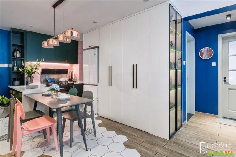 六邊形地磚和木紋地磚相拼接在無(wú)形中劃分廚房與客廳的區(qū)域,層次遞進(jìn)。室內(nèi)設(shè)計(jì)師