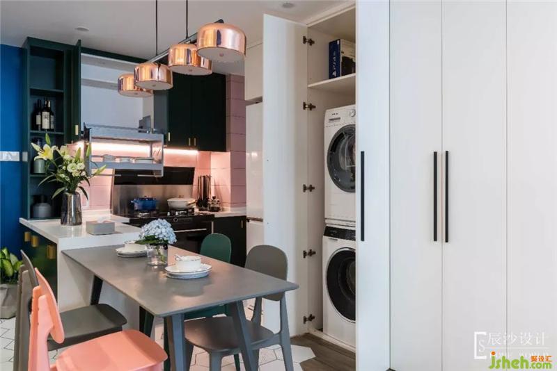 廚房增設(shè)了廚房?jī)?chǔ)物柜,既能隱藏冰箱的厚度,又能存放洗衣機(jī),大大增加了收納空間,使整體顯得干凈利落。