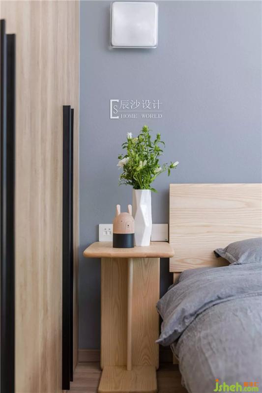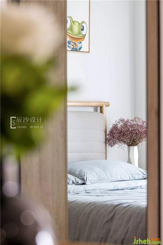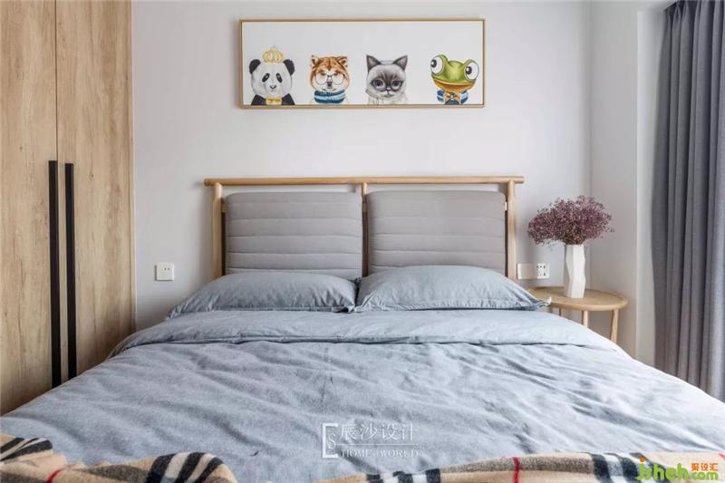 次臥就像一個小森林般自然、清新,原木床搭配淡藍色的床單,一旁的粉色干花,一呼一吸都是那么的柔和。墻上的卡通掛畫就像森林里的動物,空間變得充滿活力。室內設計師
