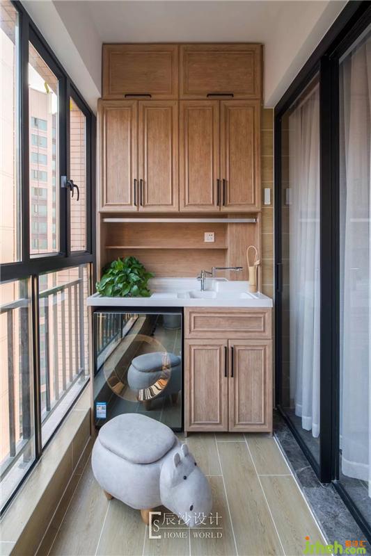 一體式的吊柜設(shè)計,充分地利用了陽臺的空間,原木色調(diào)柜子和木紋地磚相配,小盆栽的肆意點綴,都使露臺成為了享受舒適愜意居家氛圍的最佳場所。室內(nèi)設(shè)計師