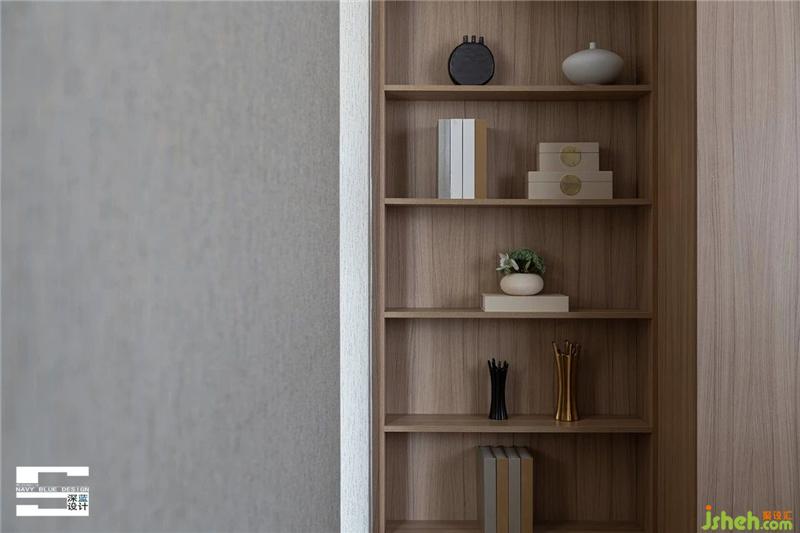 主臥無論在色彩亦或選材上都遵循整體性,奶茶色的墻面、原木色的書柜、床品、淺色系的床頭背景墻等相得益彰;室內(nèi)設計師