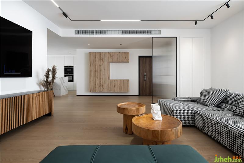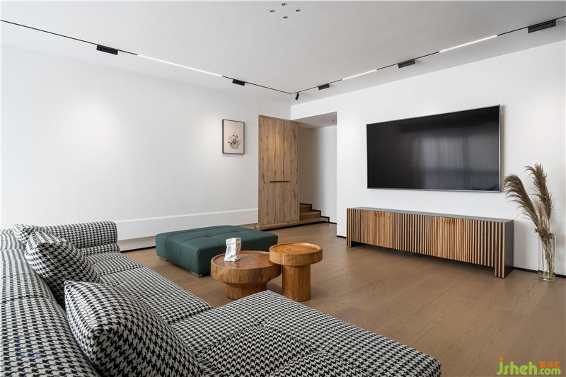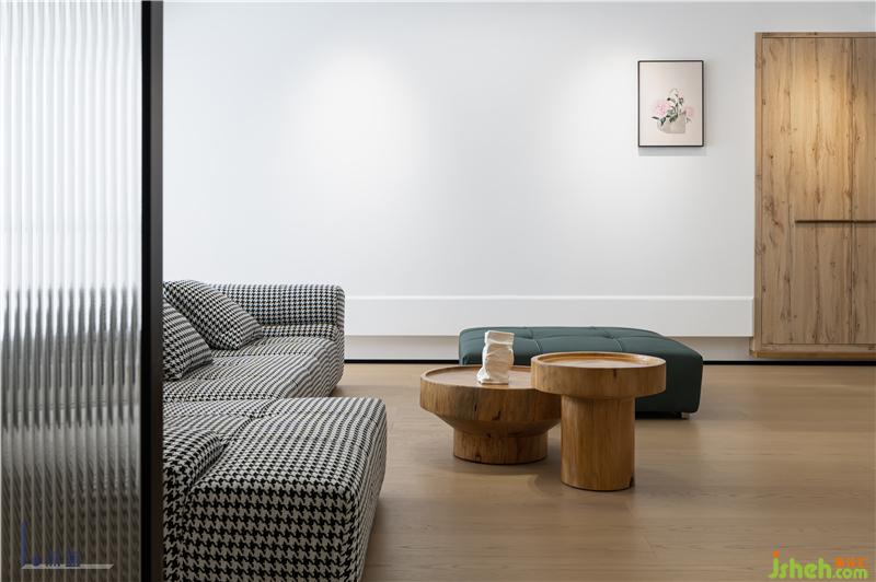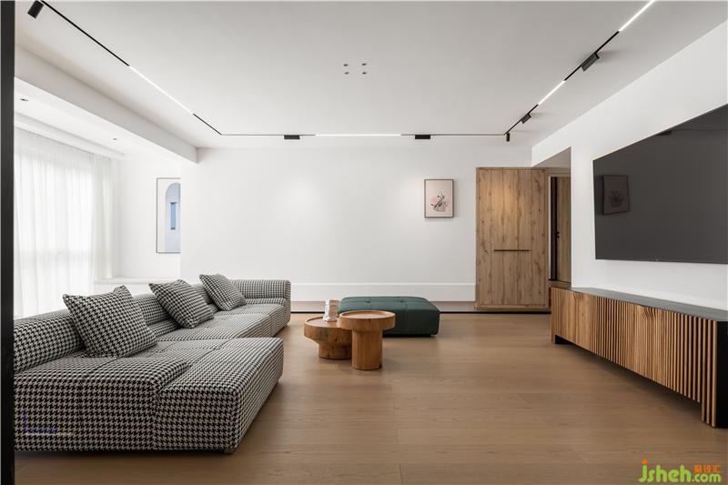 客廳以極簡的線條造型和色塊搭配出來現(xiàn)代休閑的度假式空間。大面積白色和木色形成了空間的主題。沙發(fā)采用千鳥格布藝材質(zhì)與墨綠色搭配,成為空間的點睛之筆。